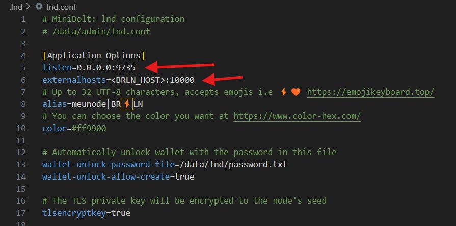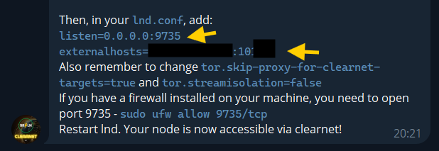 nano /data/lnd.confnano .lnd/lnd.confAdicione as linhas asseguir na sessão [Application Options], lembrando que estas opções devem ser copiadas da mensagem no telegram: