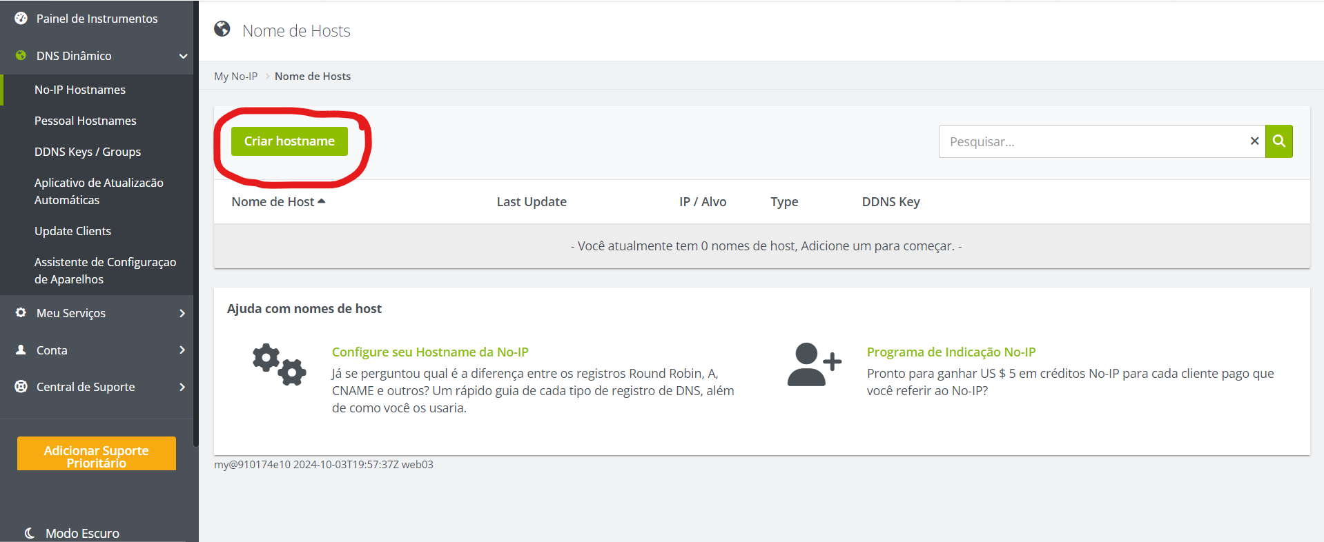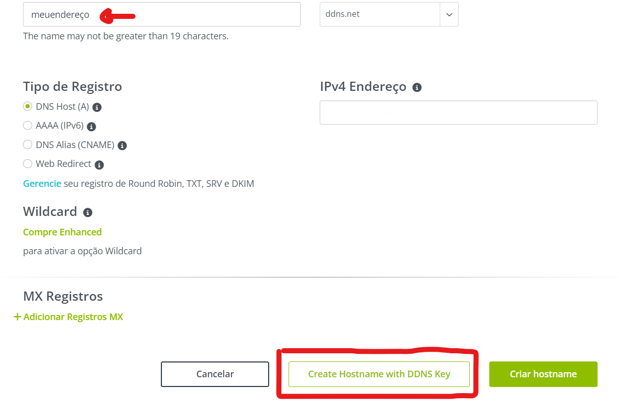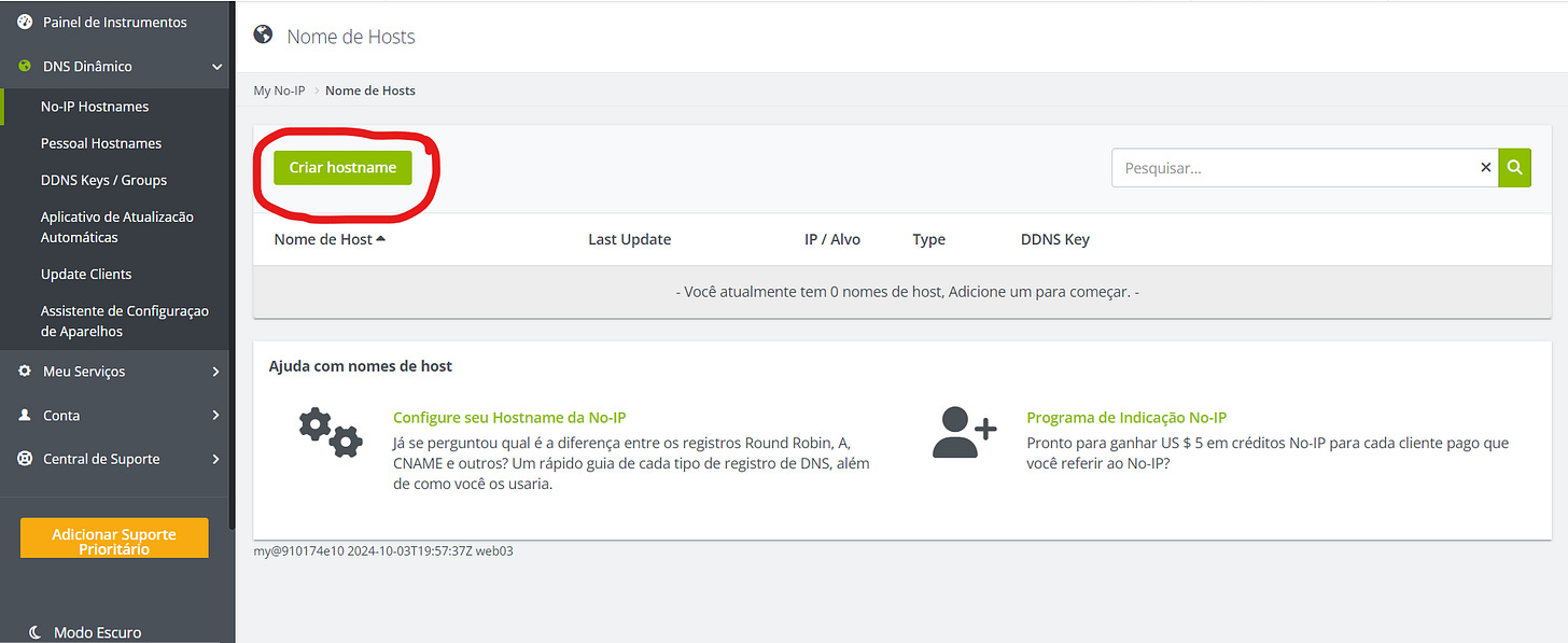Abra uma conta na No-IP, acesse a dashboard e pressione em, Criar hostname: