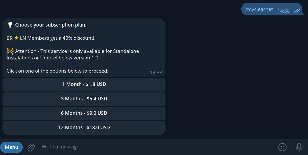 Após iniciar a conversa com o bot pressionando em “Start” na parte inferior da tela, envie o comando /myclearnet como na imagem abaixo: