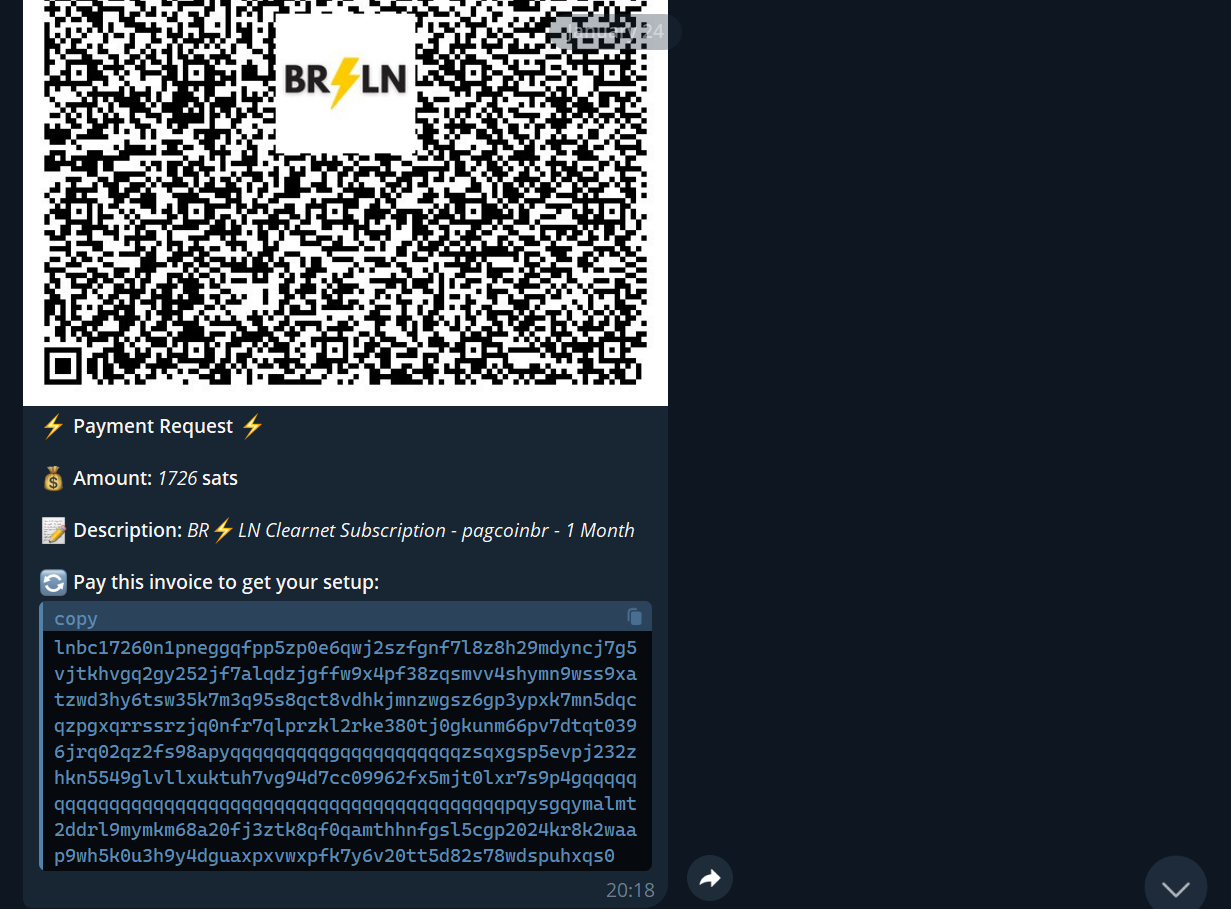 Para abrir conexão via Clearnet com seu node lightning usando uma infraestrutura de VPS, você deve escolher um serviço para usar. Aqui vamos sugerir o endereço clearnet da BRLN, você pode iniciar o processo entrando em contato com o bot do Telegram no seguinte link: Clique Aqui