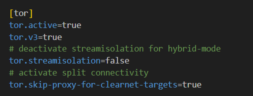 tor.skip-proxy-for-clearnet-targets=true*O parâmetro tor.streamisolation=false deve estar desativado ao utilizar o modo híbrido ⚠️.