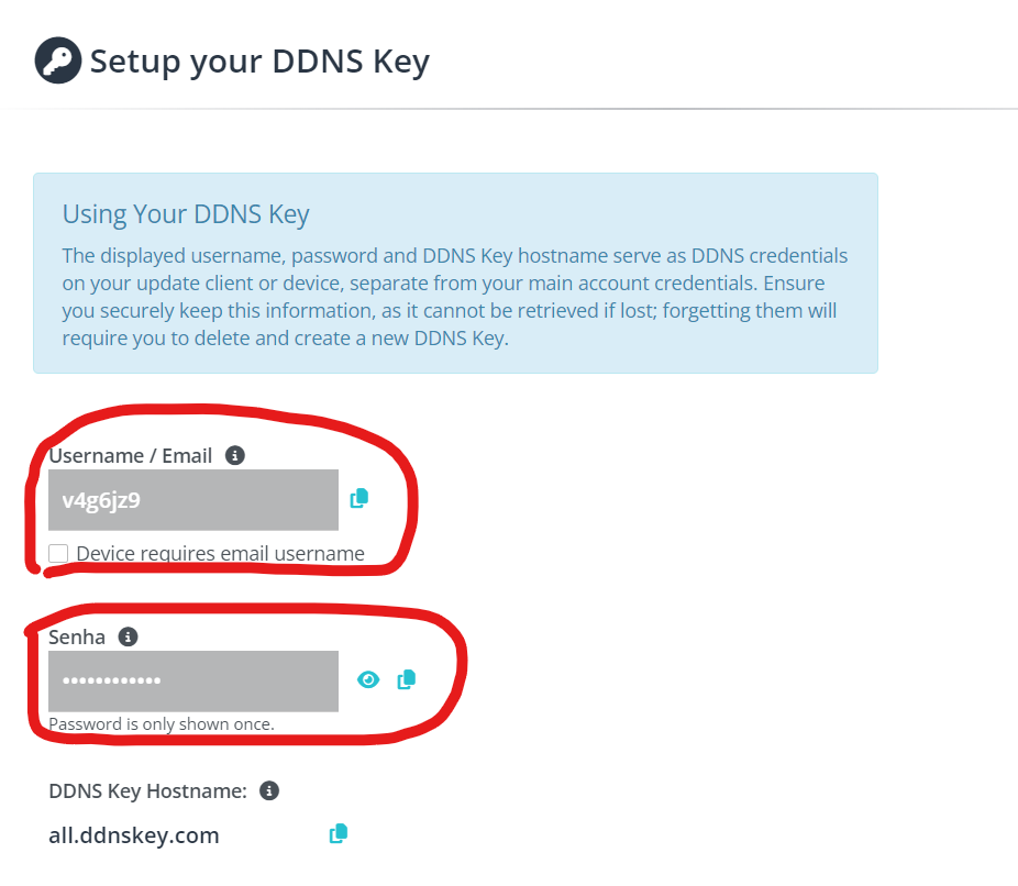 Agora você encontra-se em uma pagina onde pode-se copiar um usuário e uma senha, faça o próximo passo “Instalando o DUC” antes de prosseguir no site da no-ip.