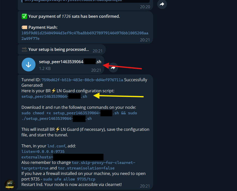 chmod +x setup_peer<nome_do-arquivo>.sh./setup_peer<nome_do-arquivo>.shEm seguida vamos fazer a configuração do nosso “lnd.conf” para aceitar conexões Cleanet, se você estiver usando um node standalone o comando pode parecer com este: