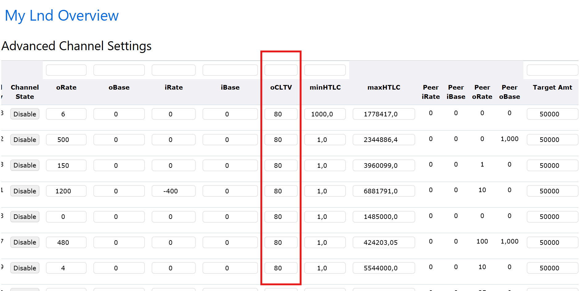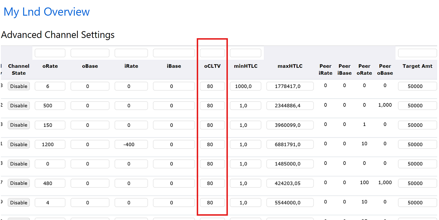 Exemplo: No caso abaixo, o CLTV está configurado como 80, ou seja, as transações que passarem pelo seu nó precisarão ter uma duração de 80 blocos antes de expirar e causarem um fechamento forçado do canal.