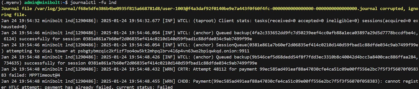 journalctl -fu lndComo a saída deste comando pode variar dependendo do erro ocorrido, o ideal é buscar ajuda especializada no site BR-LN Club ou então colocar a saída em alguma IA como Chat GPT (Use por sua conta e risco e nunca forneça suas chaves privadas).