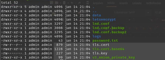 ls -la /data/lndNa instalação manual deve-se deixar o usuário “lnd” como proprietário, enquanto para os que fizeram a instalação automática o proprietário deve ser o “admin”.