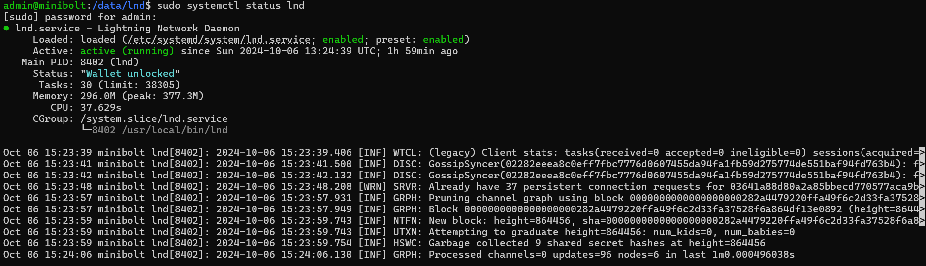 Se precisar depurar um problema ou visualizar eventos recentes, pode acessar os logs do serviço com o comando:sudo journalctl -fu lndIsso exibirá os logs gerados pelo serviço LND, incluindo mensagens de erro, informações de inicialização e outros eventos relevantes.